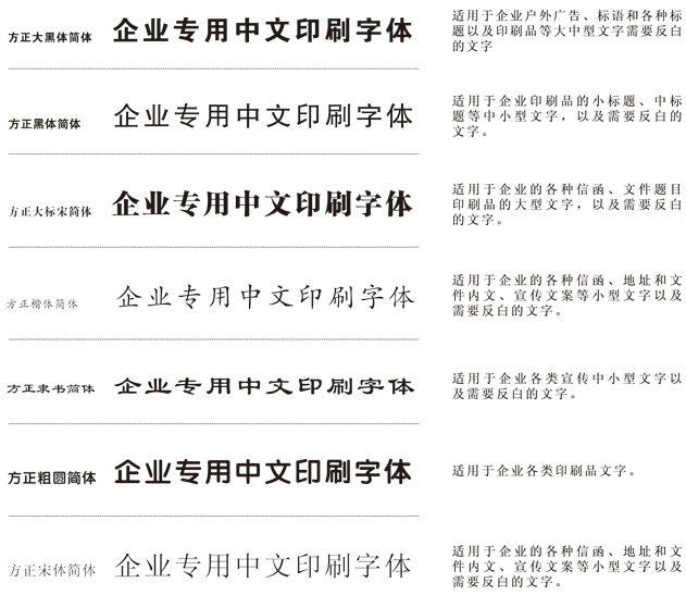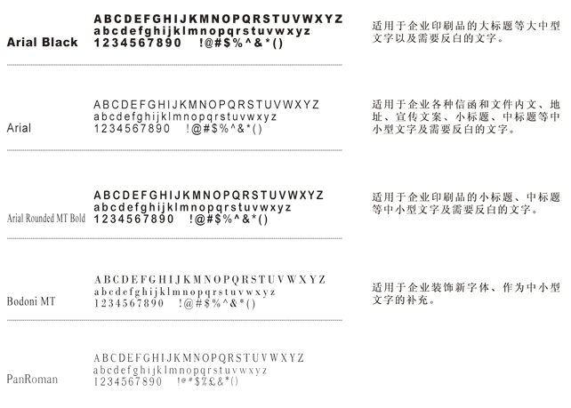 為使視覺形象更加統(tǒng)一,所有傳媒所用文字,均應(yīng)選用以下規(guī)定字體。字體允許向右傾斜20度,允許長體90%―100%,扁體110%-120%。禁止使用其他字體,特性情況(如節(jié)日、慶典)設(shè)計例外。同時,為求得運(yùn)用方便,在刊物,媒體及封面的排版上,若無相同字體時,可選擇字形相近的字體替代使用。